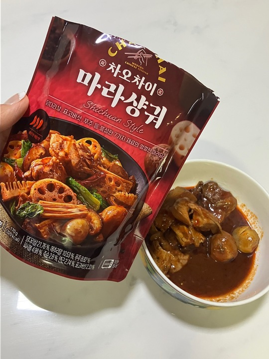 조리용 차오차이 마라샹궈소스는 배달음식에게 영원히 작별을 고하는 맛이었는데 전자렌지용은 급하게 수혈할때 나쁘지 않은 정도이다 마트에서 원쁠원하길래 사왔는데 하나는 잘못사와서 전자렌지용이당 여러가지 들어있지만 역시 입맛대로 커스텀하는게 최고! 찐은 조리용 소스이니 똑같은 패키지에 속지말고 다음에 볼땐 제대로 쟁여와야겠다ㅠㅠ