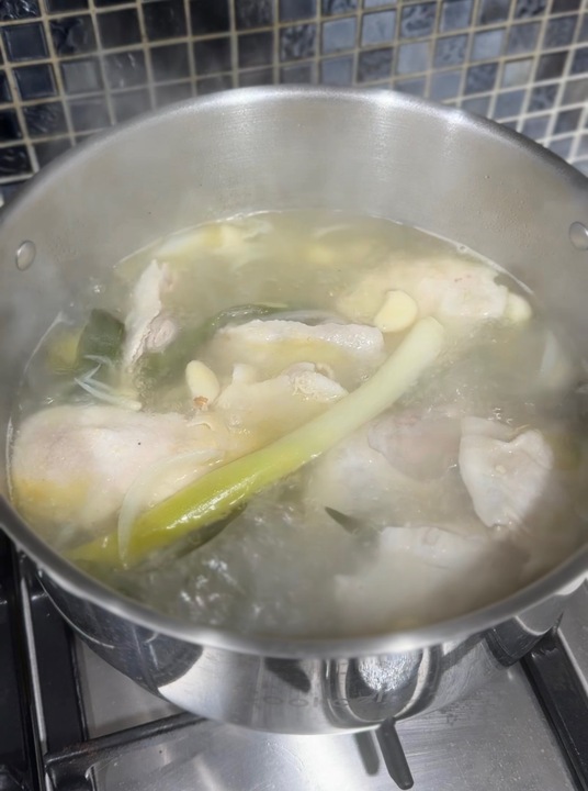 닭다리살로 자주하는 요리, 닭곰탕 5분정도 데쳐서 불순물을 뺀 닭다리살과 양파, 파, 마늘, 총후추를 넣어 푸욱 끓이고 액젓과 간을 더하기만 하면 끝 ! 곰탕에 감자가 들어간 걸 좋아하는 남편 취향에 맞게 무와 감자를 넣고 보글보글🥔