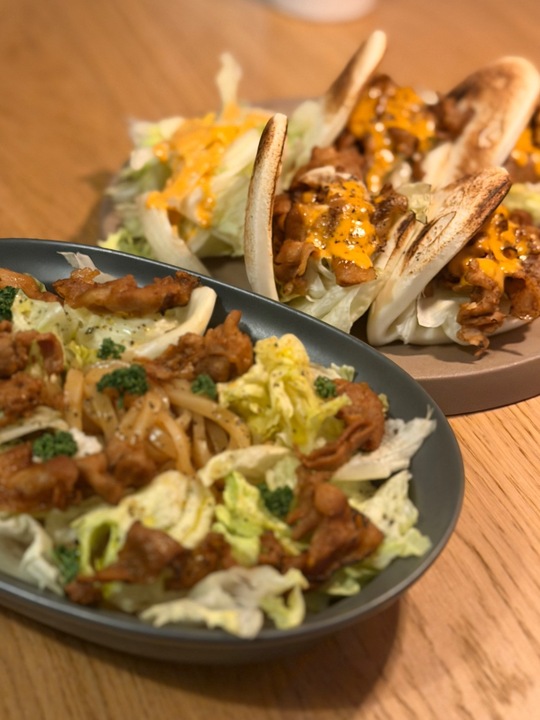 - 타코 시즈닝을 곁들인 마늘간장 대패삼겹 바오 소스는 스리라차마요 -오리엔탈 소스로 만든 우동샐러드 우동면이 파스타면보다 소스를 잘 먹어서 더 만족스러웠어요.