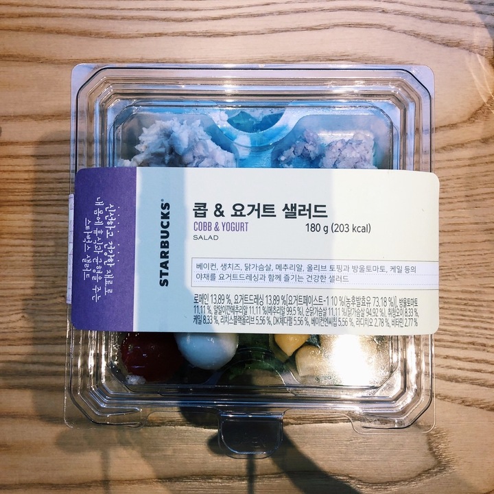 스타벅스 푸드 중 제일 많이 먹는 것- 이 샐러드가 젤 괜찮은듯 일단 한끼식사로도 손색없고 채소도 꽤 많이 들어있고 올리브 치즈 치킨 방울토마토와 매추리알까지 있음 ㅎㅎ 단독으로도 먹지만 집에 뭐가 있냐에 따라 그날 그날 과일이나 고기랑 곁들여 먹음 갑자기 친구들이 놀러올때도 이거 하나 사오라고 하면 샐러드로 내놓기 좋음!
