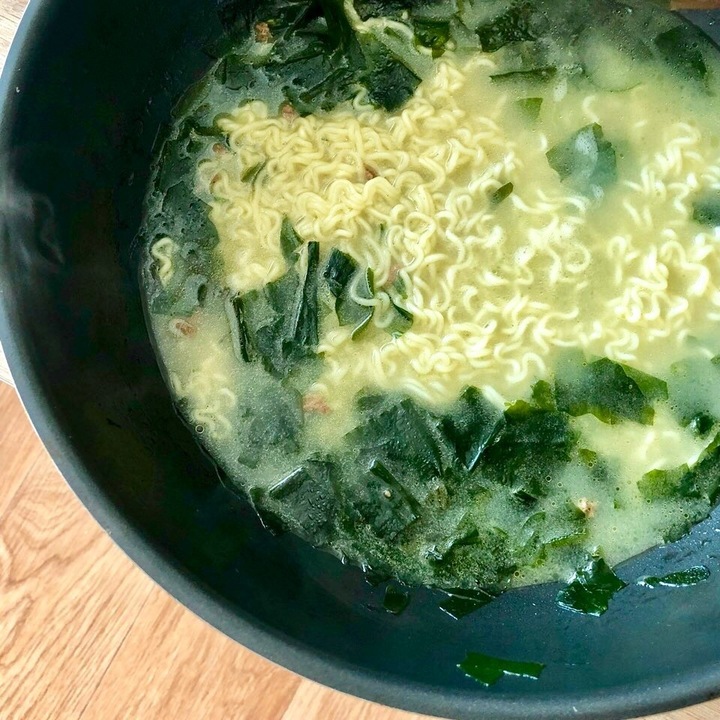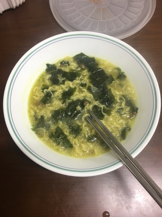 예상보다 더, 듣고 보던대로 본격 미역국! 내 입맛에는 좀 짜서 다음엔 물을 좀 더 넣어야겠다. 면의 양이 좀 적은 것 같았는데 밥 말아먹으면 되니까. 면보다는 밥이 더 어울린다.