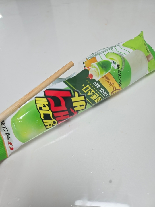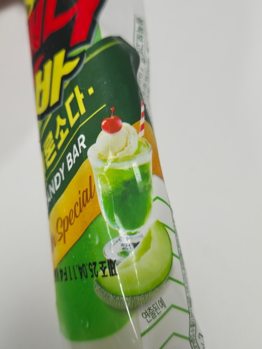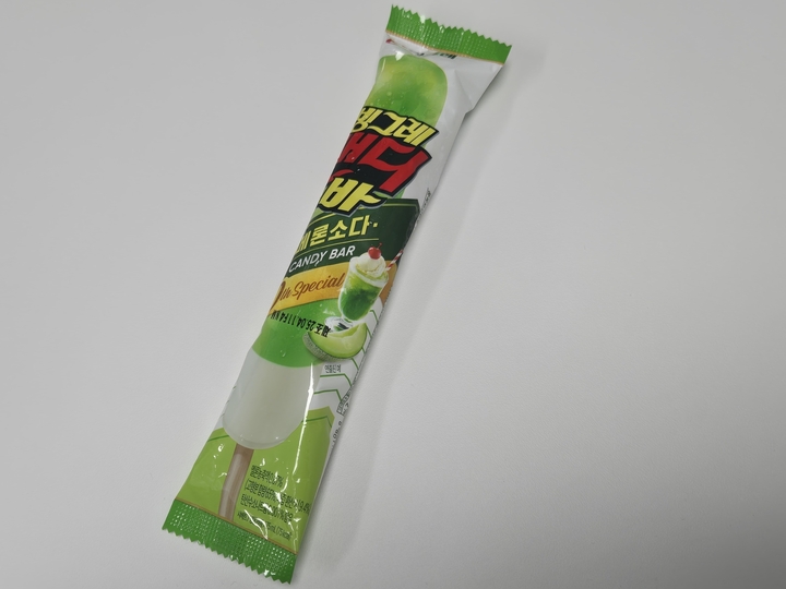 빙그레 '캔디바 메론소다' "메론 샤베트가 곁들여진 우유 아이스크림" 뽈레 보면서 먹는데 어느새 막대기만 남아 있다. 아 사진을 찍었던가? 생각이 들었을 땐 이미 마지막까지 먹어버린 상태.. 하늘색 대신 연두색이었고 역시 우유 아이스크림이 진해서 맛있었다. 오리지널과 메론소다를 고르라면 오리지널을 고를 것이다 [연출된 예]를 보면 뜬금없이 음료수인데 만드려면 겉부분 10개는 필요할듯...