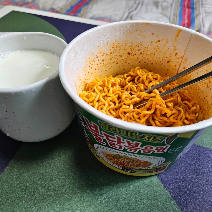 불닭볶음면 먹은 유튜브 속 외국인의 심정을 느끼며...😇 핵불닭볶음면은 안 먹어 봤지만 기본 불닭볶음면은 그런대로 잘 먹는 편인데요. 얘는 입에 넣자마자 씹기도 전에 맵고요. 맛을 느끼려다가도 아파요😭 콧물 줄줄, 뒷골 당기게 얼얼.