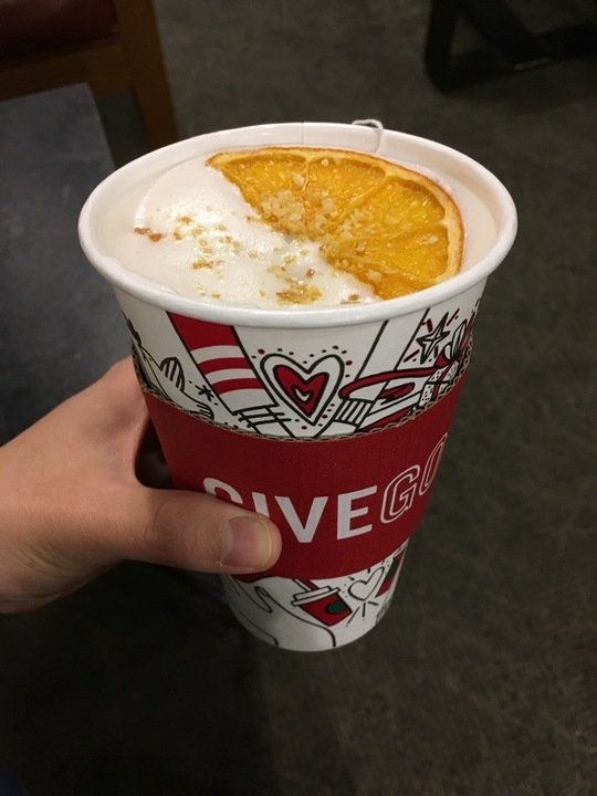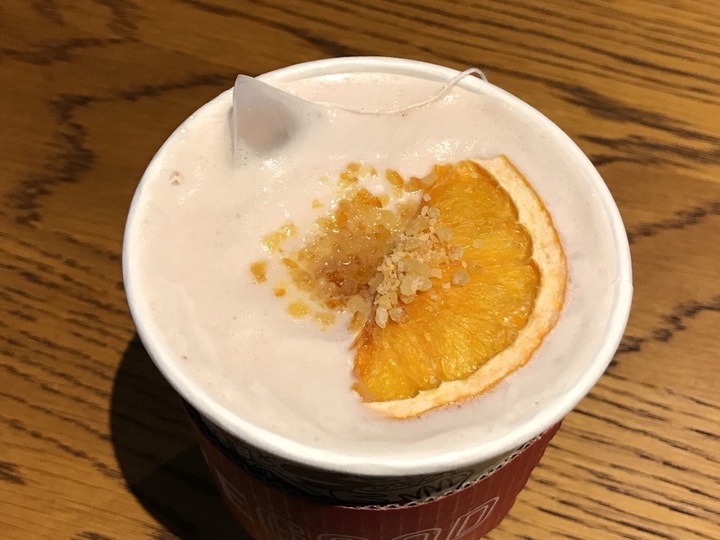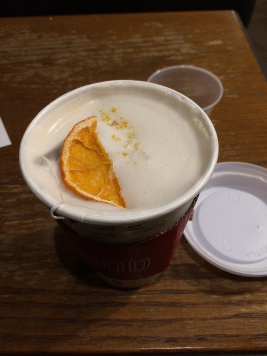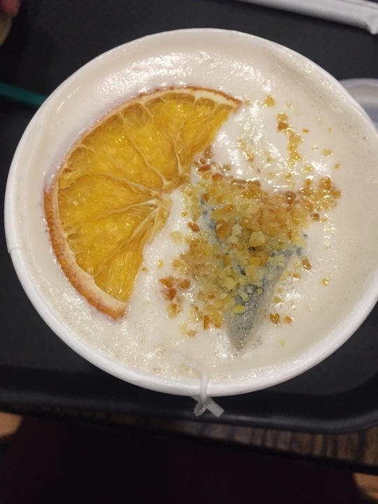개운한 음료를 좋아하는 나이기에 보통 아메리카노, 허브티, 홍차 셋중에 하나를 주문하는 편이지만 어제 날이 너무 추워져 뭔가 달달이가 먹고 싶어서 주문. 밀크티에 오렌지를 잘 조합한 맛. 밀크티를 좋아하기에 행복하게 먹었다. 재주문 의사 메우 있음.