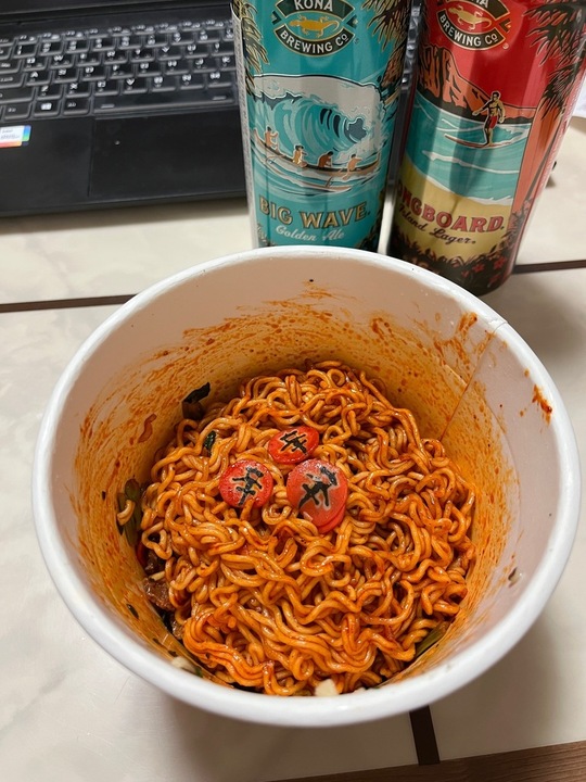 이 라면은 정말 기름에 볶아야 맛있네요. 무쇠팬+우삼겹이 하드캐리한 건 맞지만, 라면 스프가 액상이 아니라 가루인 게 신의 한수에요. 정말 빠짝하게 볶아지거든요. 친구들 불러서 돼지파티하기 좋은 음식입니다💜