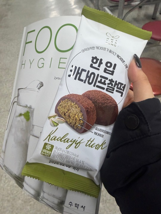 씨유에서 난리라는 한 입 카다이프찰떡 성공했어요! 카다이프가 정말 두쫀쿠에 들어가는 촉촉느낌이라 놀랐어요 이런 퀄이 나온다고..? 겉은 이름처럼 찰떡이라 아주 쫀득쫀득해요 찰떡아이스느낌?? 씨유어플로 재고 확인하고 달려가세욥
