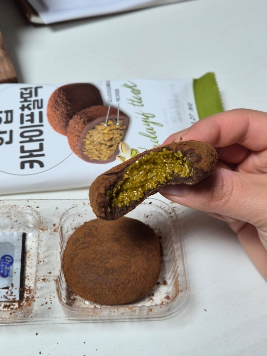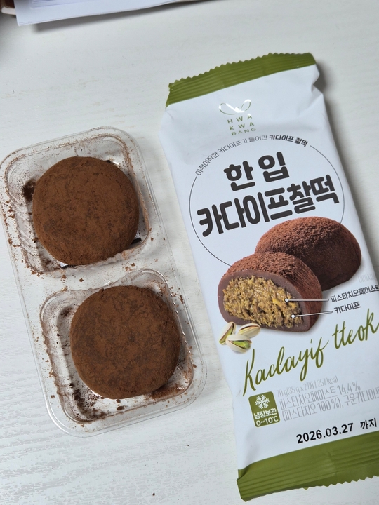 🧆🍡 한입 카다이프 찰떡 (3,900) 두쫀쿠라기보다는 두쫀쿠에서 아이디어를 받은 떡 안에 뭐가 들어갔는지 엄청 고소하다. 깨? 참기름? 들기름?의 느낌이 난다. 그래서 송편 느낌이 나기도.. 떡은 말랑하고 쫀득하다.
