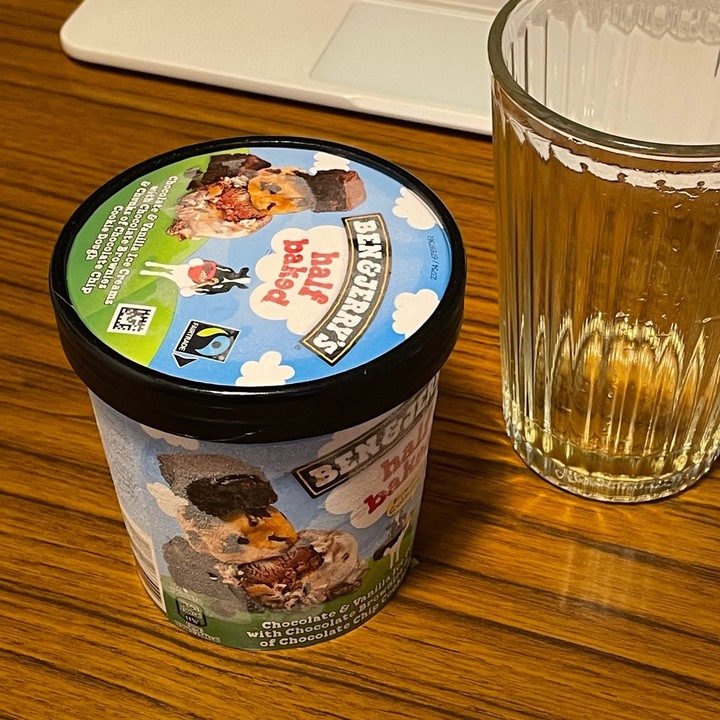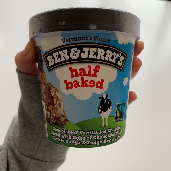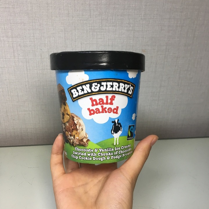 벤앤제리 half baked 바닐라 밀크초콜릿 두 가지 베이스에 쿠키도우와 브라우니가 꽉꽉 들어차있어요🤤 벤앤제리는 비싸서 두 통 사기 힘들기 때문에 한 번에 여러맛을 즐길 수 있는 얘가 제 fav입니다.
