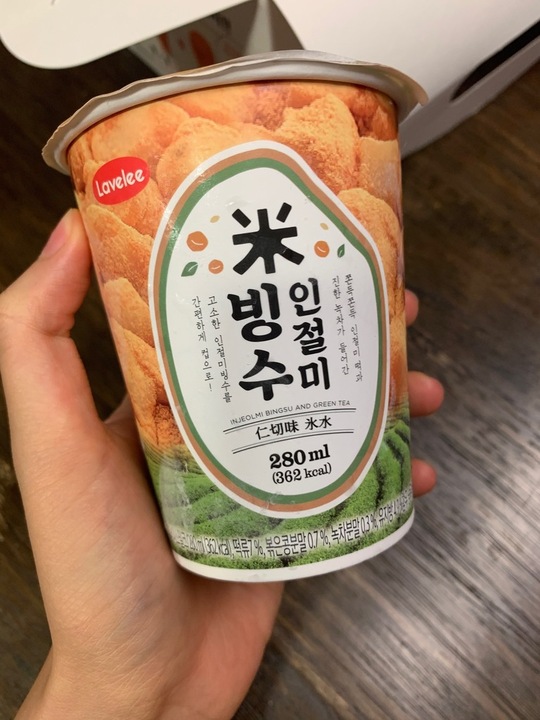 라벨리의 망고빙수를 맛나게 먹은 기억이 있어서 구매해본 인절미빙수. 위에는 떡, 중간에는 달고 서걱서걱한 빙수, 밑에는 진한 녹차빙수가 깔려있다😊 gs25에서 구매! #세나템