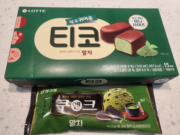 요즘 말차맛 아이스크림들 너무 맛있네요^^ 제 개인적인 입맛은 티코는 말차맛이 연한듯했고 티코는 다크초코가 젤 맛있었ㅎ 전 쿠앤크 말차맛이 적당한 말차맛에 가장 맛있더라구요ㅎ 빙그레 쿠앤크 말차 👍