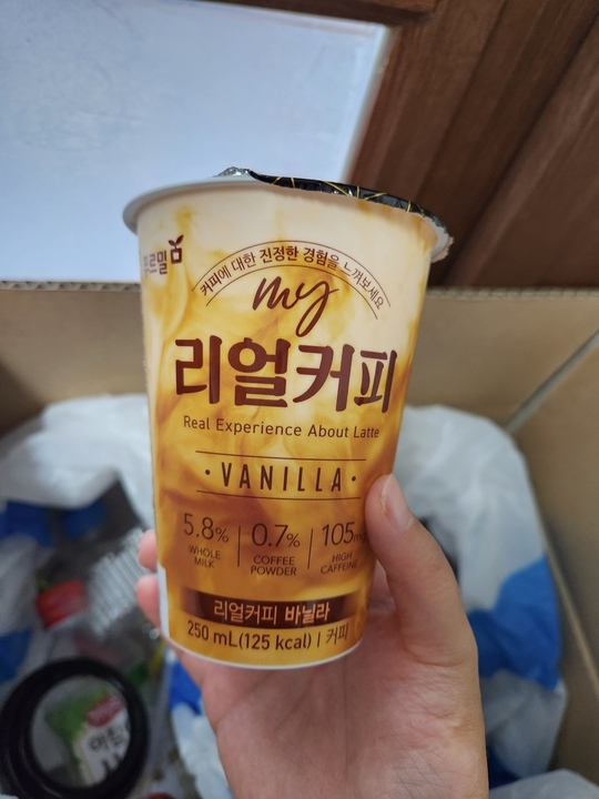 푸르밀 리얼커피 바닐라맛 편의점커피 그놈이 그놈인데 이거는 먹고 너무 맛있어서 버렸던거 다시 주워서 사진찍었어요 텀블러에 얼음담고 커피 붓고 물 좀 태웠는데 진하고 적당히 달달해서 좋았어요 편의점 커피맛에 약간의 바닐라향과 흑당시럽맛? 암튼맛남 추천욥