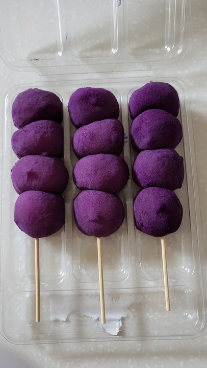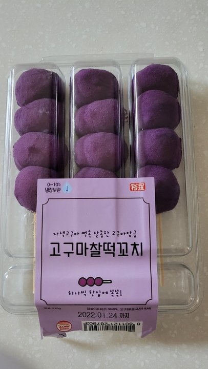 홈플러스에 파는 고구마찰떡꼬치에요. 고구마앙금이 달짝지근하고 엄청나게 찰기있는 떡이네요. 간식으로 간단히 먹기좋아요. 냉장고에넣어놔도 굳지않아서 넣어놨다시원하게 먹는것도 맛있었어요