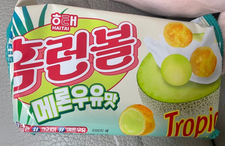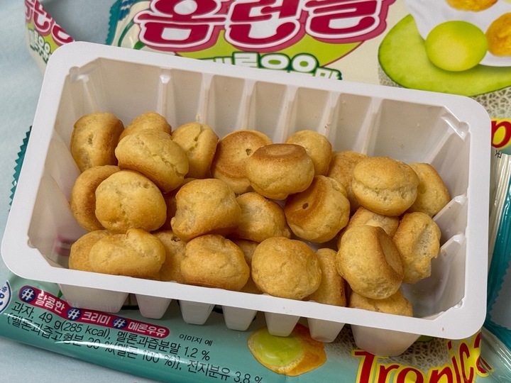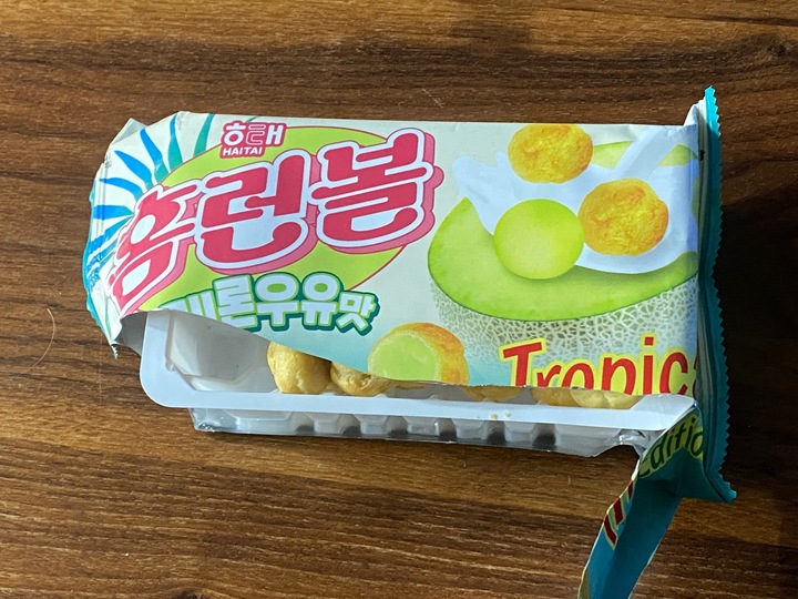 [홈런볼 메론우유맛] 얼려 먹어야 맛있을 것 같아서 바로 얼렸어요 🍈 메론향이 기분 좋게 나긴 하는데 살짝 물리니까 주변과 나눠먹으세요.