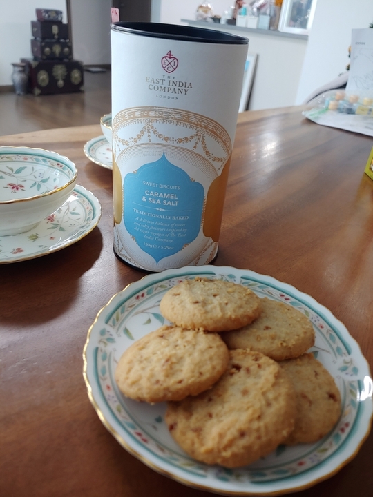 쿠키에 뭐가 박혀있는데 뭐가 박혀있는지 모르겠더라고요. 바삭바삭한 쿠키고..(그래서 부스러기가 매우 많습니다..) 전형적으로 단짠이 잘 느껴지는데 캬라멜향이 꽤 진한 편이라 어떤 차와도 잘어울릴 것 같은 티푸드입니다. 적당히 떫은 맛을 내는 차랑 같이 마시니 부담스럽지도 않고 정말 맛있었어요. 절반정도 남겨뒀는데 다음번 티타임도 즐겁게 즐길 수 있을 것 같아요🎉