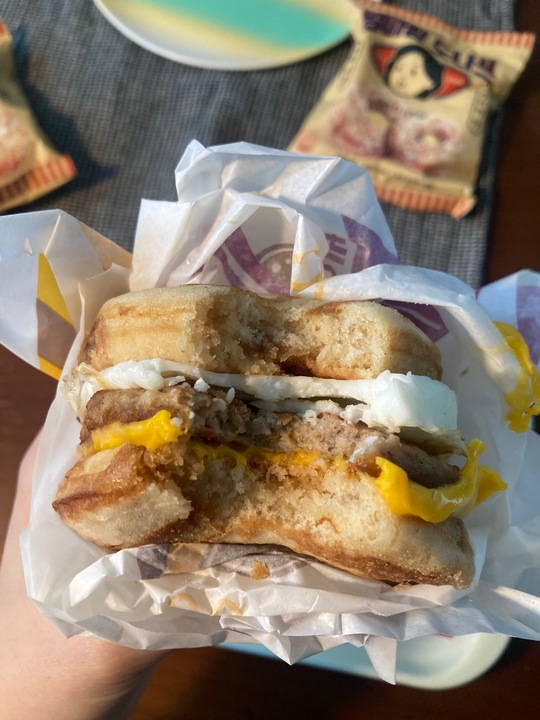 맥도날드 '소시지 에그 맥그리들' "퐁신달달해서 더 부드러운 맥머핀" 핫케이크 특유의 향과 머핀빵 쫄깃함이 부족해서 좀 아쉬웠다. 덜 달다면 자주 먹었을지도.