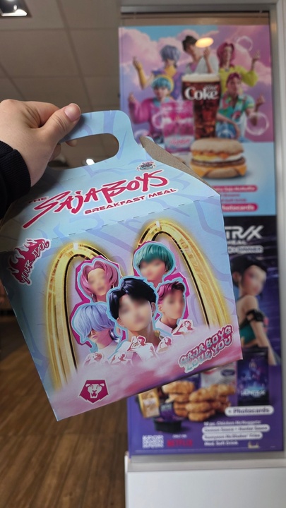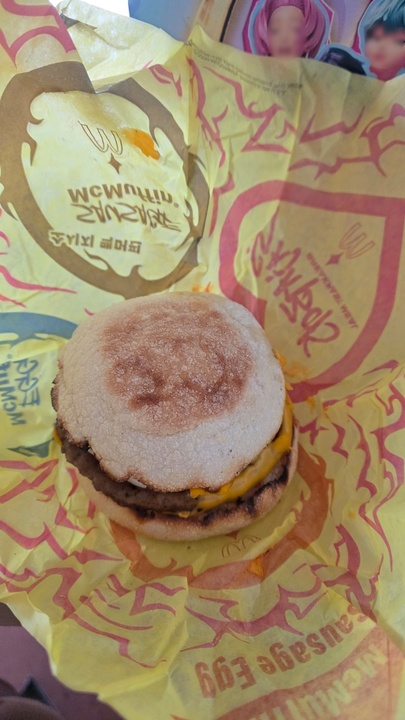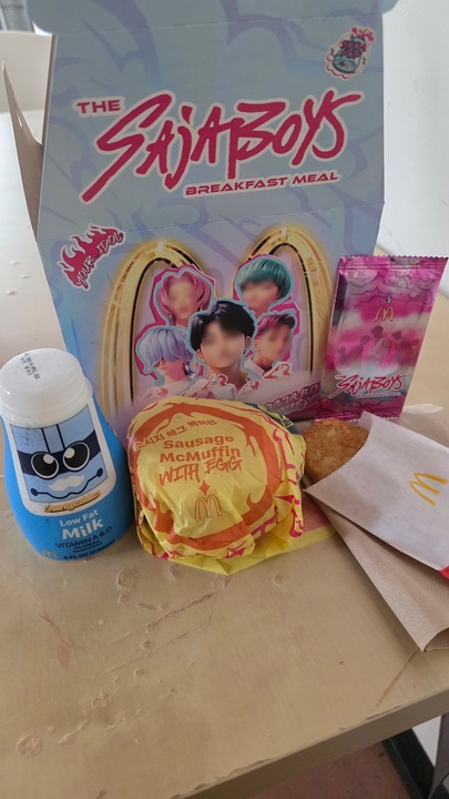 사자보이즈 브렉퍼스트 밀 구성은 음료 스파이시 사자 맥머핀 해시브라운 포카 입니다 맥머핀 진짜 맛있어요!!!! 매콤소스가 잘어울려요 포카 미스터리 나와서 절망했지만 뭐 괜찮아요.. 포장지에 한글로 적혀있는데 국뽕 올라와요