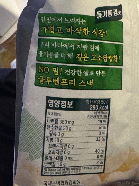 롯데마트에서 2,790원엔가?? 구매함 얇고 바삭하고 들기름 향나고 김향도 남 들기름 향이 강하진 않음 그래서 와구와구 먹을수 있는듯 맛있음 맛있어서 뜯자마자 다 먹음. 작은 봉지 아님 꽤 용량 있음 재구매의사 낭낭해서 또 사옴