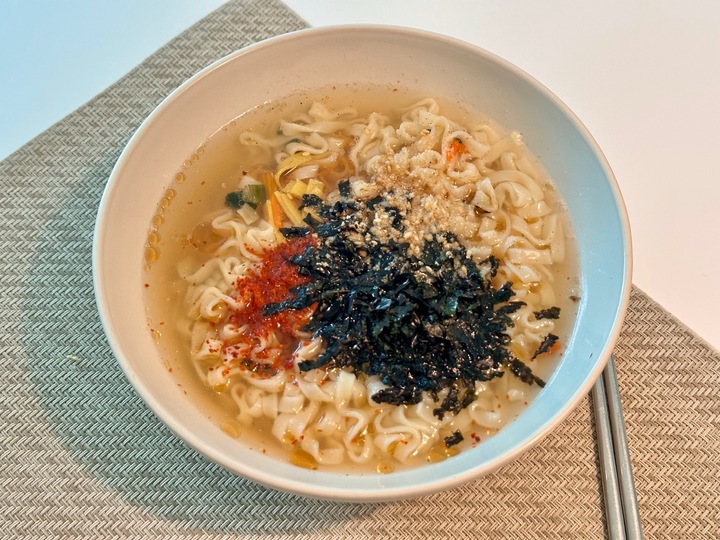 요즘 유행하는 멸치칼국수 10분 레시피로 만들어봤어요. 물 650ml 넣고 멸치칼국수를 10분 끓인 뒤에 참기름, 통깨, 고추가루, 김가루 넣고 먹으면 되는데요. 딱 상상했던대로 베테랑 칼국수에서 간장 뺀 하위 호환 느낌인데 괜찮았습니다. 어려운 것도 아니어서 또 해먹을 의사도 있습니다.