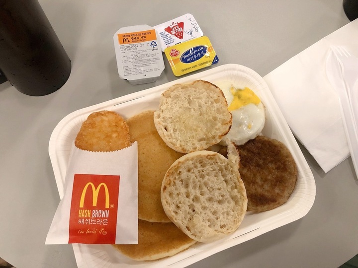 디브렉 안에 스크럼블 에그 없어졌구나.. 대신 걍 머핀에 들어가는 에그로 대체. 그냥 소시지에그머핀에 핫케익 추가된 구성이당. (소에머핀 해체되어 있으므로 직접 쌓아 먹음. 칼질하고 싶으면 그냥 먹는 걸루) 쩝 가격은 단품 두개 따로 시키는 거보다 싸다. 햄에그 머핀도 없어졌고 뭐뭐 모닝이 많이 가벼워진 맥날쓰 그리고 해쉬브라운 언제나 니글거려ㅠ 다 못먹음