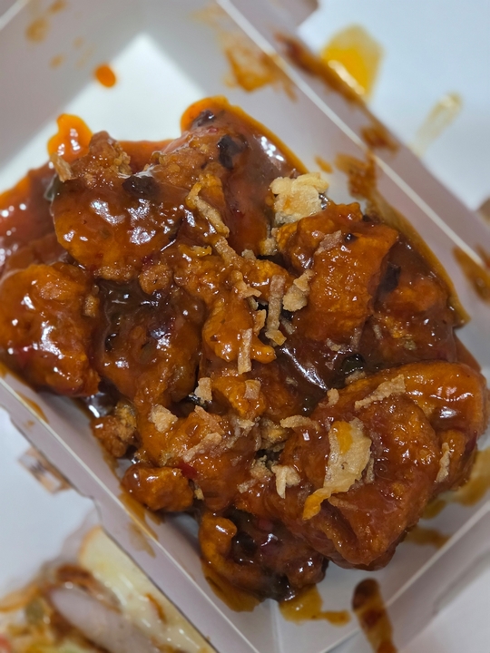 어향 가지 소스를 응용했네요. (휴먼후덕죽체처럼)새큼매큼한 소스. 목이 버섯 등이 보임. 먹다보니 물린다 소스가.