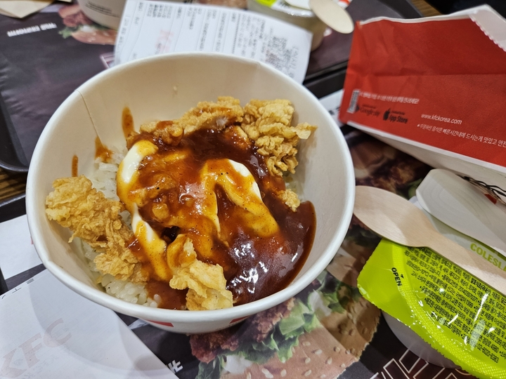 Kfc앱에서 치밥, 텐더 2조각, 콜라 세트로 할인받아 6900원에 먹었습니다. 기본으로 주는 치킨 만으로는 토핑이 부족해 텐더가 꼭 필요하고 소스가 달아도 너무 답니다.. 전에 먹은 bhc화이트 소스 들어간 양념치킨도 엄청 달았는데 치킨쪽에선 이정도 단맛이 먹히는걸까요