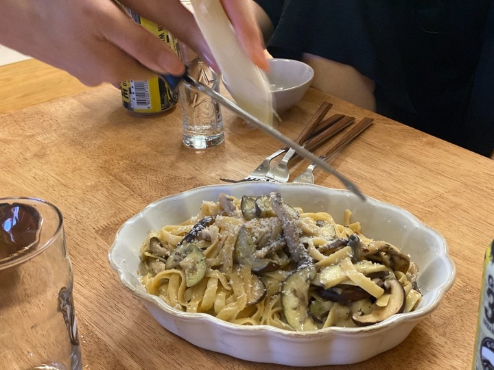 우유를 넣었어요 :) 마지막에 넣는 레드페퍼치즈파우더는 보노스프향이 납니다-_-? 전 집에 있는 치즈를 뿌렸어요. 표고에 새우에 음 맛있는 걸 넣어서 맛있어진 것 같긴 하지만 ㅋㅋㅋ 2분만 조리하면 먹을 수 있는 투움바파스타! #몇인분이냐고묻지마세요 #이마트트레이더스
