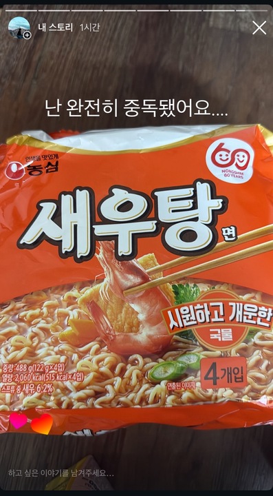 새우탕 컵은 안먹어봤지만 친구가 봉지라면이 넘사라고해서 한번 사봤다가 네 봉짜리 또 사왔네요... 매일 먹습니다 요즘 ㅠㅠ 하 ㅠㅠ 찐으로 새우랑 꽃게 넣어서 먹는 라면 보다 왜 이게 맛있을까요