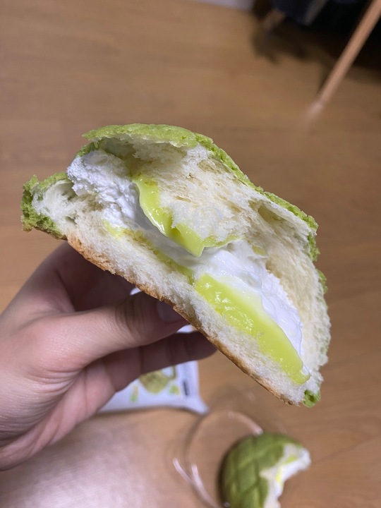 안에 크림 가득하고 묵직한 예전 느낌이 없어서 아쉬웠음 맛은 메론크림+생크림 섞인 맛에 겉에 메론소보루가 바작해서 달달하고 맛있었음 메론빵 처돌이로서 웬만한 개인&프랜차이즈 베이커리에서 사먹는 메론빵보다 맛있었음! 메론빵이 너무 먹고 싶은데 주변에 파는 곳이 없다면 또 사먹을 의향있음