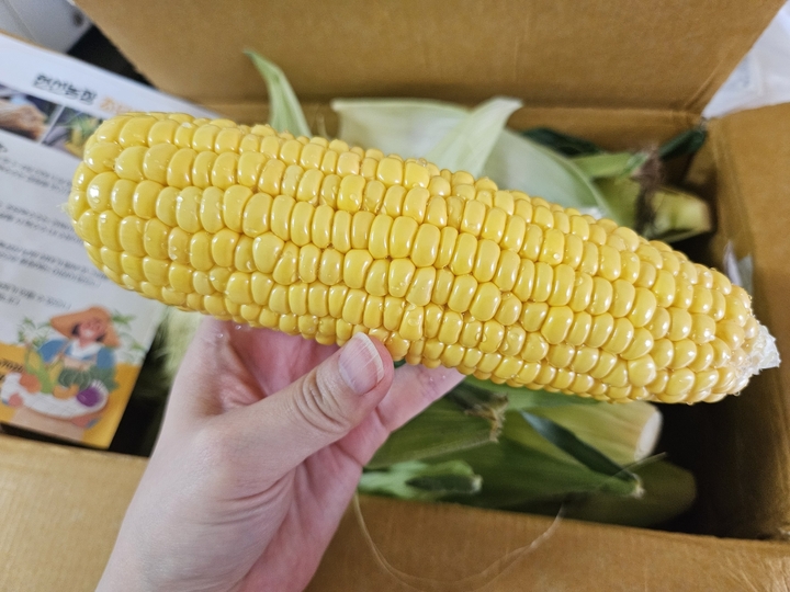 초당옥수수 막차! 근데 막차라서 그런지 좀 억센 느낌(물론 그래도 초당이라 부드럽고 아삭하긴 합니다ㅎㅎ)에 단맛이 좀 적은 것 같기도 하고🤔 내년엔 제철에 사서 먹어야겠어용ㅋㅋ 다른 업체에서 샀었지만 시즌 시작할 때 먹었던 건 연하고 달달했거든요!