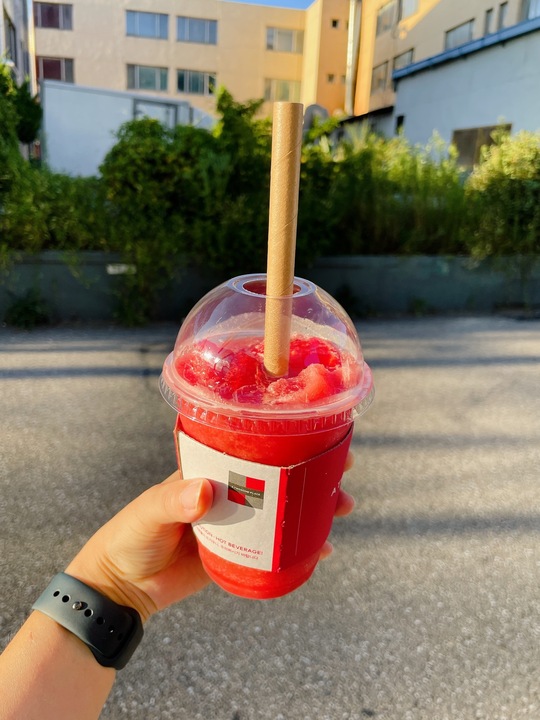오 기대가 없어서 사진을 안 찍었다가 생각보다 넘 맛있게 마셔서 황급히 다 마신걸 찍었습니다 시원하고 달달한 딱 수박주스!!!!!입니다 수박도 세덩이 들어있는데 맛있었어요 주문하자마자 믹서기 가는 소리가 들렸는데 정말 수박을 갈아서 주시는듯합니다 시럽이 들어갔는지 안 들어갔는지는 모르겠지만 시럽특유의 맛은 안났어요 정말 이런 맛있는 과일주스는 당만 아니면 매일 마시고싶어요 ㅠㅠ