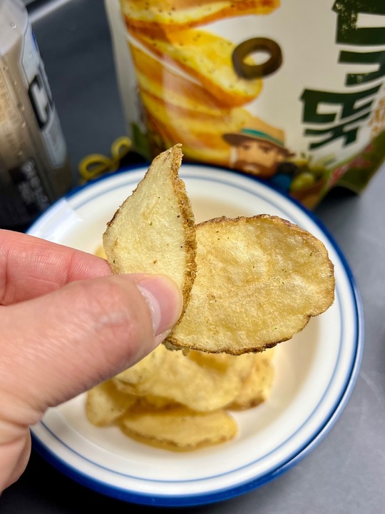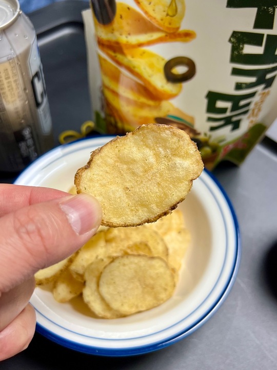 올리브 앤 솔트 맛. 두꺼운 감자칩이다. 첫 향부터 올리브 냄새가 진동. 향 뿐이 아니라 맛도 상당히 올리브적이다. 피자 위의 까만 올리브만 모아 놓은 맛인데, 소금 맛은 어디 갔는지, 감자가 두꺼워서 다 떨어져 나갔는지 심심하다. 올리브가 지나쳐서 조화롭지 못한 감자칩....올리브 좋아하는데도 이건 좀....