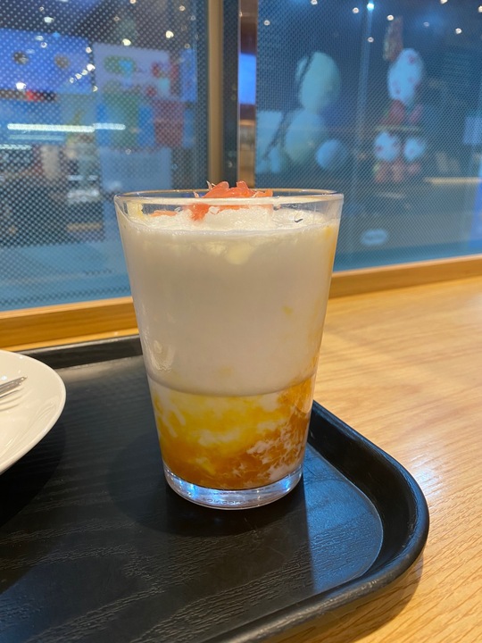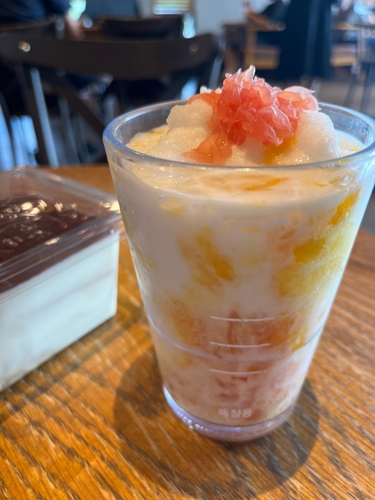 다른 후기에서 코코넛 러버는 마셔 보라고 하던데 자몽이랑 코코넛 맛은 생각보다 약해요..! 비율 따라 맛이 다를 것 같은데 망고 퓨레가 많이 들어가서 망고 스무디같은 맛? 안에 코코넛 젤리 들어가서 씹는 맛도 있고 상큼보다는 단 맛이 강해요😆 뭐가 많이 들어가서 가격은 사악한 편이네요ㅎㅎ