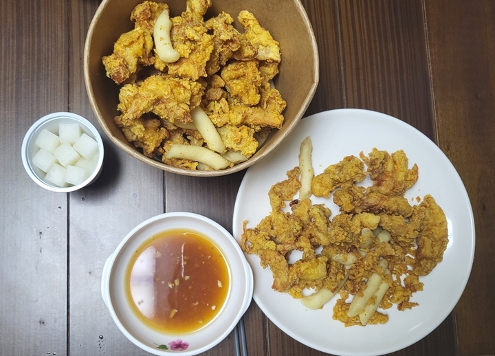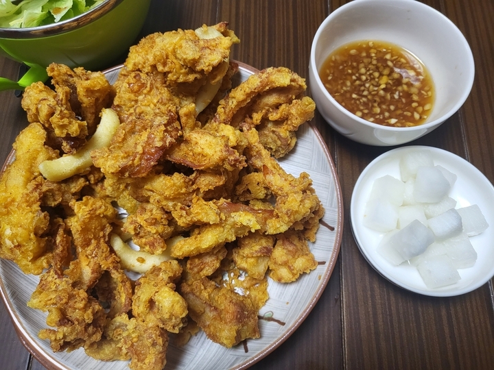 담가먹으면 바삭바삭 속살은 촉촉해서 너무 맛있어요. 이번 마늘은 아릴정도로 엄청 알싸했어요! 소금찍어먹고 양념치킨소스 찍어먹고 물리지않았어요
