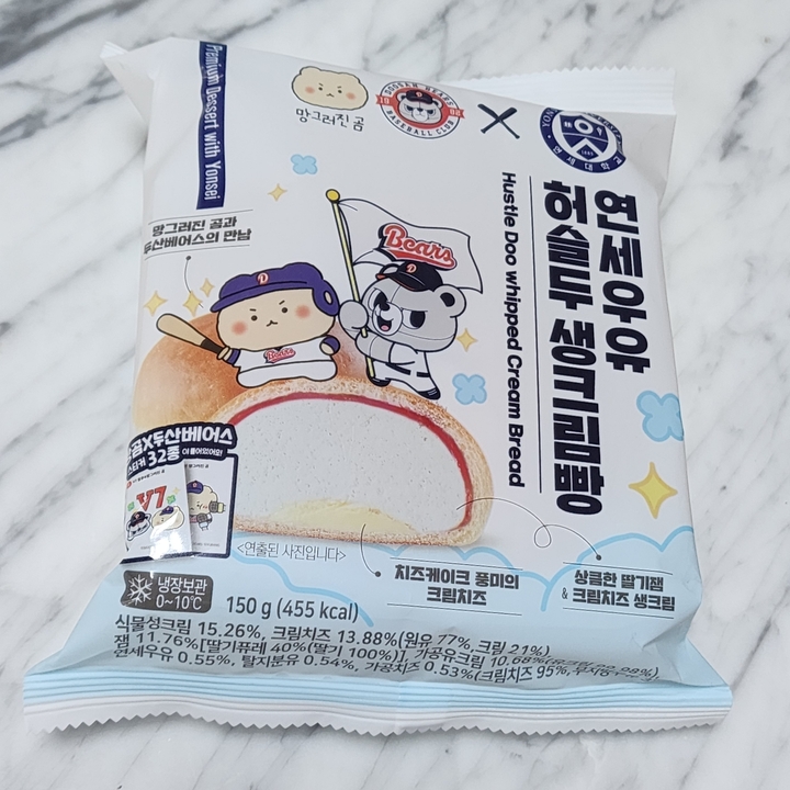 연세우유 '허슬두 생크림빵' "망곰이 생크림빵" 패키지에 혹해서 산 것도 있겠지만 딸기쨈 + 크림치즈(그것도 치즈케이크 풍미가 나는) 이 조합이 손을 이끌었다. 우선 정석 생크림이 아니어서 입에 맞다. 생크림의 가벼움과 느끼함이 아쉽다 하면 이거 꼭 먹어보길. 케이크 느낌이 잘 살아 있다. 망곰이의 인기 때문에 철웅이 띠부씰은 뭔가 배척받는 느낌. 마스코트인데?!