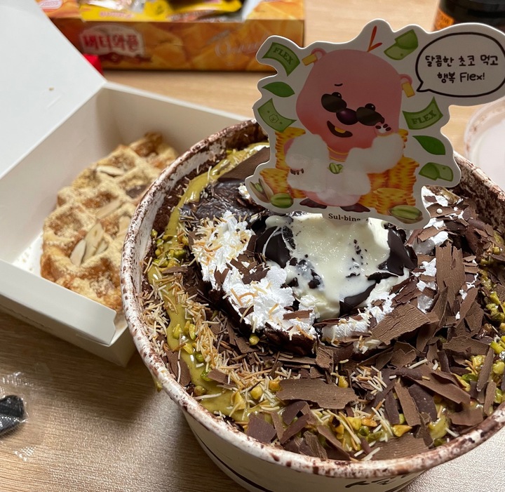 ✔️잔망루피낭만초코설빙 잔망루피는 못 참치. 두바이초코 열풍은 아직도인가요..? 근데 생각보다 낫배드. 시판 두바이춰컬릿보다 맛있어요. (물론 제 기준 엄청 달아요)
