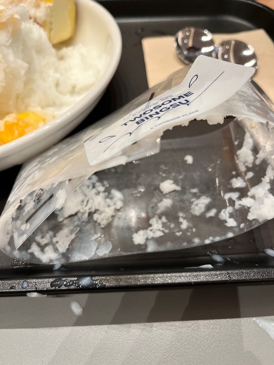 작년에 투썸 빙수를 맛있게 먹은 기억이 있어서 올해도 사먹어봤는데 실망스러워요. 얼음은 녹아있고 망고와 치케는 얼어서 숟가락으로 으깨지지도 않고… 포장지를 풀자마자 세 번째 사진처럼 빙수가 다 퍼집니다. 케이크 빙수라는 건 누구의 아이디어인지… 토핑이 이렇게 꽝꽝 얼면 치아 약한 사람은 우째 먹으라는 건지. 투썸 디저트류가 점점 별로인 거 같아요; #빙수를찾아라