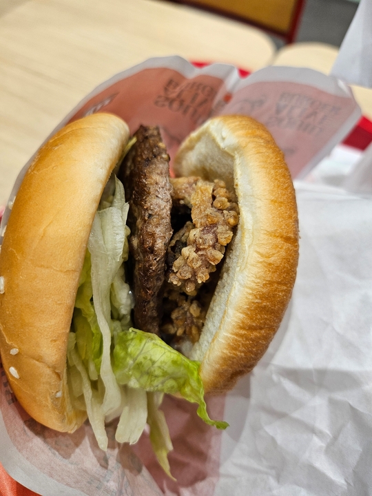 오징어 얼라이브 버거를 상당히 만족스럽게 먹어서 이틀 뒤 오징어 얼라이브 비프 버거를 먹었는데 이건 또 영 아니올시다. 소고기 패티와 오징어 다리 튀김이 썩 조화롭지 못하고 도리어 오징어가 더 비리게 느껴졌어요. 아니면 오징어 얼라이브 버거 먹었던 지점과 달라서 그론가 오징어 튀김도 더 질겼네요🤔