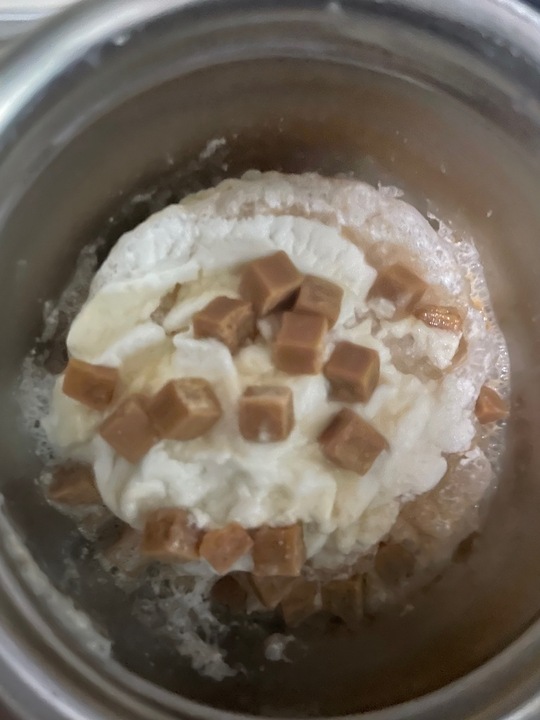 혈당 쭈아악 올라가는 엄청 단 메가톤바 맛. 위에 캬라멜은 얼어서 그런지 좀 퍽퍽함. 이건 내가 먹을 게 아니다 🥲