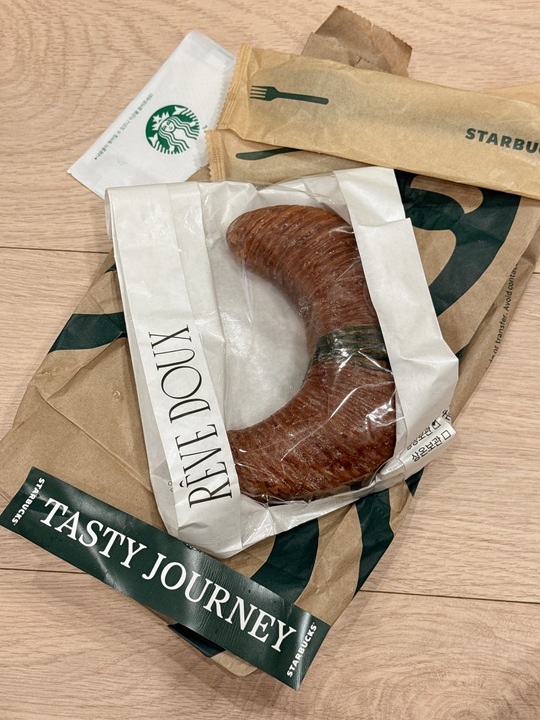 스타벅스 테이스트 저니 3월 신제품으로 잠실 디저트 카페인 레브두와 협업한 제품이다. 서울 매장 중 지정된 6개 매장에서만 구매할 수 있다. 안에는 피스타치오 크림이 들어있는데 고소함은 나쁘지 않았고 조금 달달한 편. 바닥부분에 초코코팅이 되어있는데 오독오독 씹혀서 잘 어울린다. 크림들어있는 부분도 맛있긴 한데 페스츄리의 끝부분은 빠작해서 더 맛있다🤣