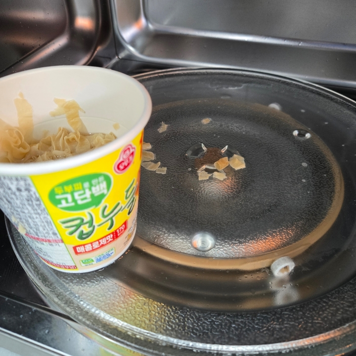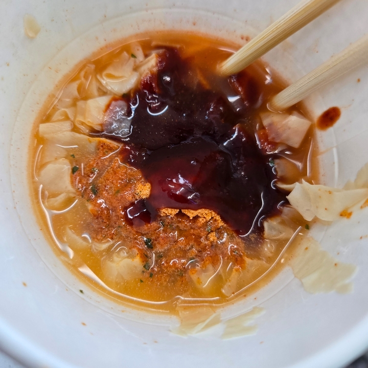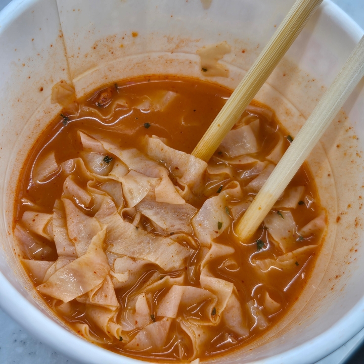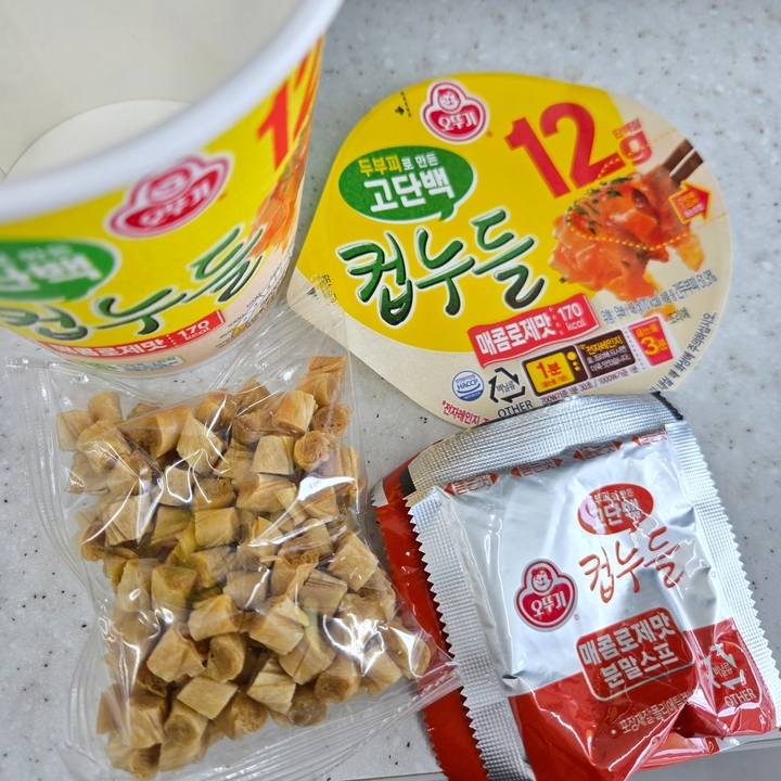 오뚜기 '컵누들 매콤로제맛' "달큰한 로제물에 빠진 두부면" 두부면으로 만든 컵누들? 확 끌려서 구매했는데 단백질 함량도 높다. 뚜껑 여니 조그마한 두부면 등장. 황당하면서도 귀엽다는 생각이 들었다. 스프는 액상과 분말 2개 들었다. 크게 맵지 않아서 주먹밥 말아 먹으면 맛있다. 물이 너무 많은 것 같은데 선보다 적게 부어 비빔면처럼 즐겨야 할듯!