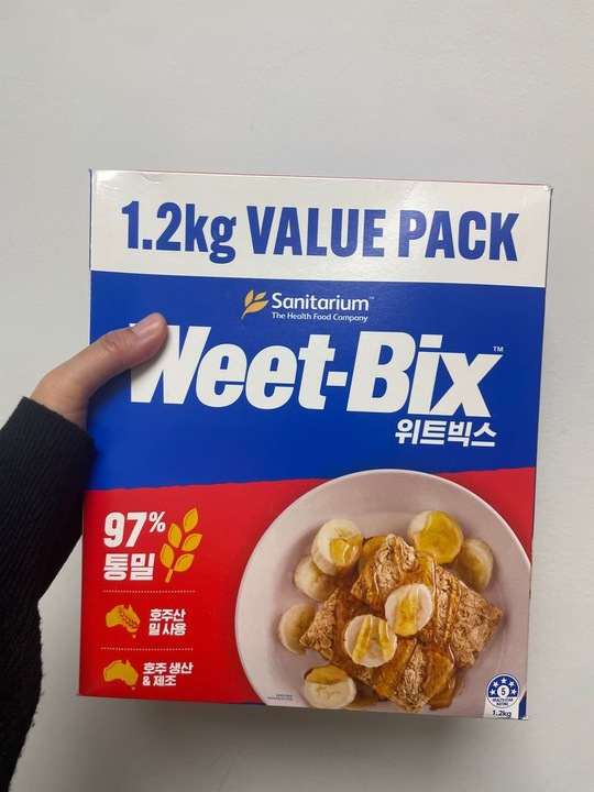 호주 사료라고 불리는 위트빅스~ 오트밀 맛없는거 못 먹겠어서 일하다가 간식+ 식사대용으로 선택했는데 물이든 우유든 나쁘지 않게 먹을 수 있어서 좋아요~