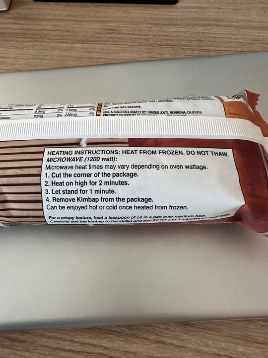 처음에 나올 때 없어서 못먹었다는데 오늘 트조가니 있어서 사봤어요 트조에서 파는 다른 미국인용 한식과 마찬가지로 달아요 제 입맛엔 한인마트에서 파는 롯데브랜드 냉동김밥이 더 맞는거 같네요. 재구매는 안할듯