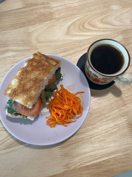 내가 만든 포카치아 샌드위치 내가 만든 당근라페 내가 내린 드립커피 예쁜 그릇 예쁜 컵 예쁜 코스터