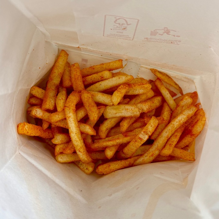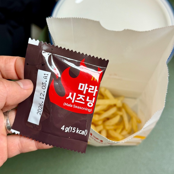 오호 이 정도면 마라 체험판으로 써먹기 딱 좋겠습니다. 일단 소스가 넉넉한 것이 마음에 들었고 소스만 먹었을 땐 확실히 자극적인데 패티와 해쉬브라운이 중화해주고 번이 살짝 단맛이 있어서 전체적인 밸런스가 딱이었습니다. 5백원 추가하면 감튀용 마라 시즈닝을 주는데 딱 기분 좋을 정도의 마라맛이라 괜찮았네요.