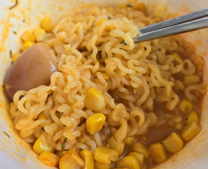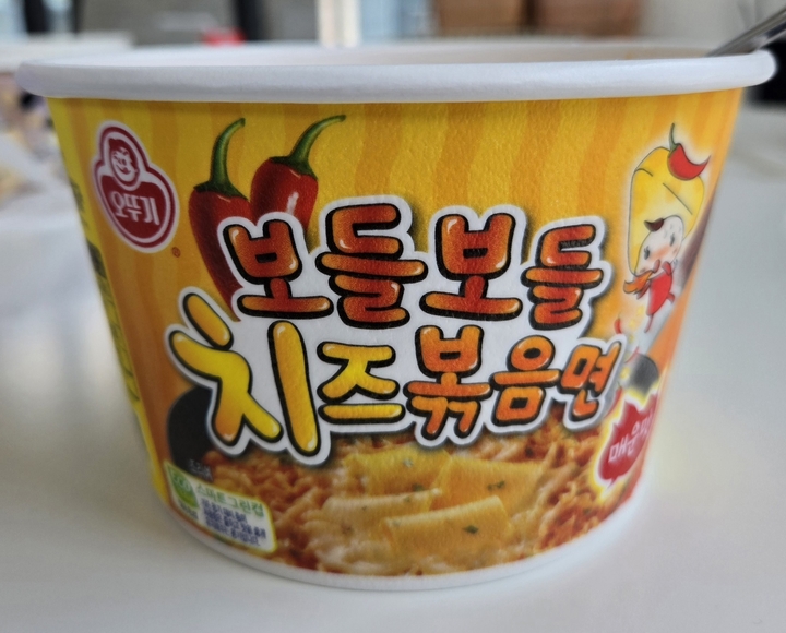 오뚜기 '보들보들 치즈볶음면' "삼김이 떠오르는 추억의 맛" 고등학생 때 야자쯤이 되면 그렇게 컵라면이나 주먹밥이 맛있었는데. 오랜만에 물 부어가지고 옥수수콘과 구운계란을 넣어서 점심 뚝딱! 살짝 달지만 매콤으로 커버하니 합격~! 삼김이 당기는 건 어쩔 수 없는 것 같다🍙