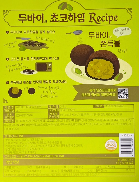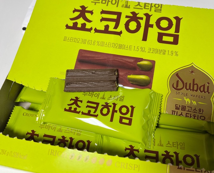 두바이 유행의 막차 크라운 두바이 스타일 쵸코하임🧆 그냥 피스타치오 초코하임이라고 정식 출시 합시다(?) 생각보다 달달하고 피스타치오 맛이 많이 나는 편이다. 뒷 편에는 크라운 롱스를 이용해서 쫀득볼 만드는 법도 있다. 당류가 38%로 높은 편이라 조금 조절해서 먹는게 좋을거 같다.