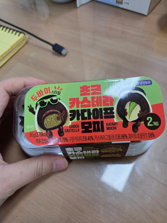 이마트24 초코 카스테라 카다이프 모찌 🤩갠적으로 카다이프모찌는 이마트 24가 젤 내 취향 - 가격은 5,800원(요즘 카페에서 파는 창렬가격 생각하면 무난한듯하다) - 겉에 초코가루가 묻혀져있고, 찹쌀떡 베어무는 식감인데 안에 카다이프랑 스프레드 맛이 잘 느껴진다. - 카다이프 식감이랑 스프레드 맛도 잘 어우러져서 카다이프 중 젤 완내스ㅋ.ㅋ 이마트 24에 디저트 보일때마다 쟁여놓는다.