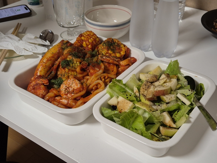 유튜버 은수저가 광고하는 훈훈수산 보일링씨푸드. 1팩에 2인분이고 홍새우,관자가 넉넉한 편이다. 우동사리를 같이 넣고 소스와 비볐는데 아주 좋은 선택이었다. 맛은 무난무난 괜찮았고 와진짜대박미친! 은 아니었다. 항상 궁금했는데 드디어 궁금증 해결~!