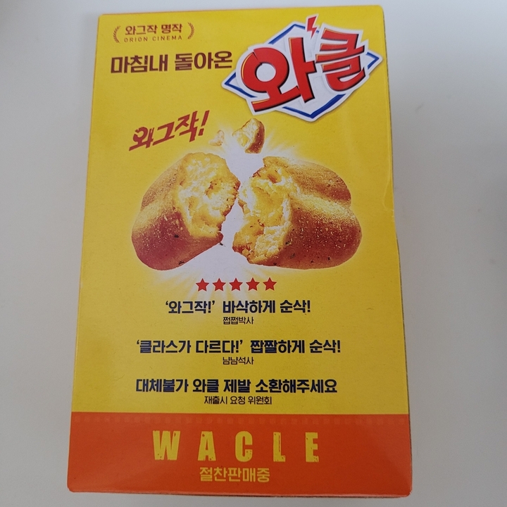 긍정: 단짠느낌. 마늘향과 양파향이 나는 시즈닝이 넉넉히 묻어있고 과자 특유의 바삭한 식감과도 잘어울어지는 맛. 한입에 먹기 좋은 크기. 부정: 손에 가루가 잘묻어난다. 예전 와클은 사실 모르겠고, 어릴때 먹던 가늘고 길게생긴 뽀뽀리라는 과자가 생각나는 맛이었다.