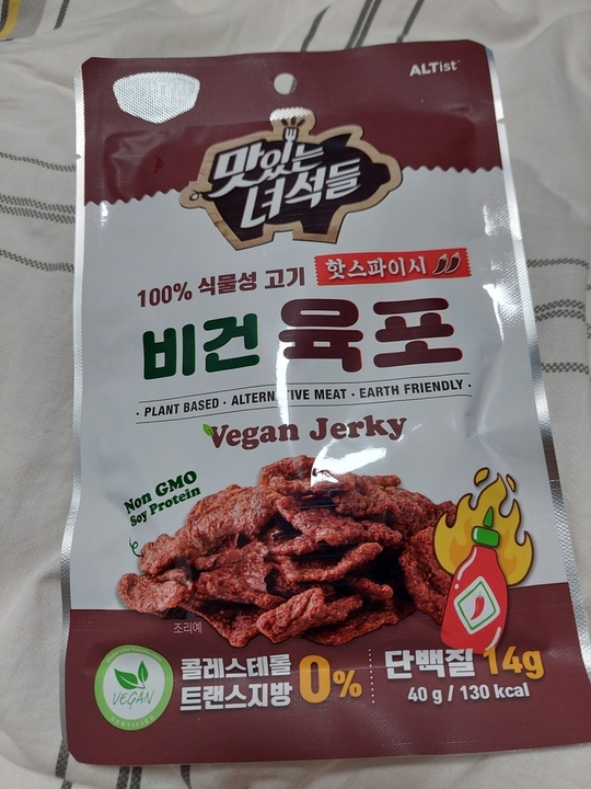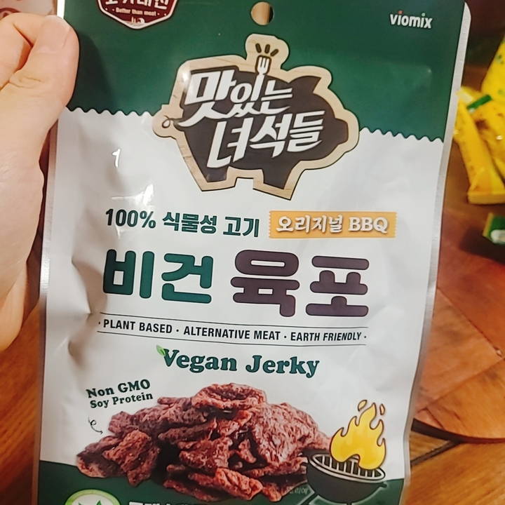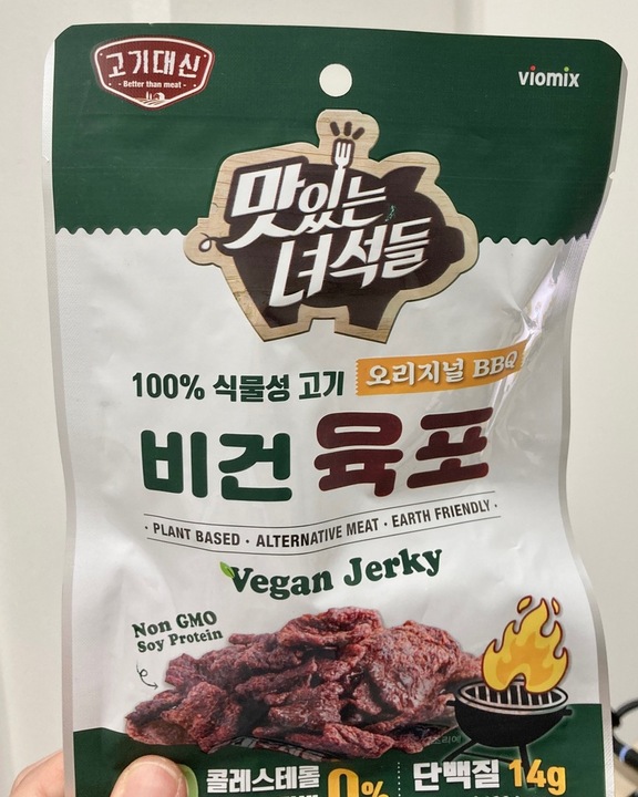 제가 비건은 아니지만 관심이 많아서 살짝살짝 먹어보고있습니다 식감이나 향은 육포와 비슷해요 끝에 콩비린내(제가 콩을 싫어해서 ㅠ) 확 나긴하지만 콩을 좋아하는 사람들은 느끼지 못할정도입니다 짜장라면 시즈닝 냄새가 중간에 훅훅 나요 오리지널맛과 매운맛이 있는데 매운맛은 진짜 매워요 지금 세븐일레븐에서 1+1에 판매중이에요